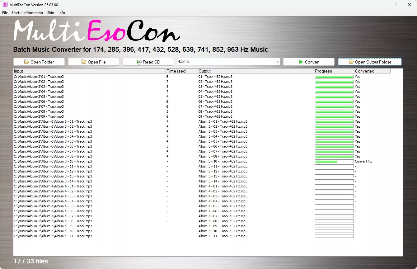 The Windows converter supports these popular audio formats: MP3, WAV, M4A, AAC, AIFF/AIF, FLAC.Besides 432 Hz, some converters offer frequency presets that are commonly referenced online, including sets often listed as “Solfeggio” frequencies. If you need a specific target frequency, look for a “custom frequency” option in the converter you are using.